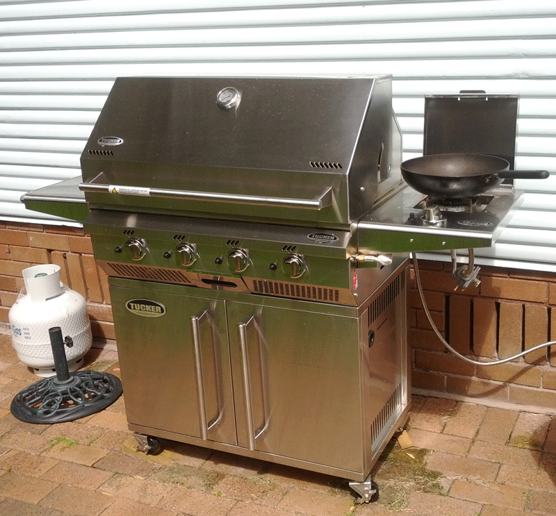 När jag hör ordet grill tänker jag genast på grillen vi hade när jag var liten, en klotgrill med grillkol i. Grillen här är grill deluxe, en riktig Barbeque grill. Den går på naturgas och du har såväl grillyta, stekyta och en gasplatta för att koka t.ex. ägg i. En riktigt underbar maskin. Än så länge har jag bara använt plattan för att göra äggröra 🙂