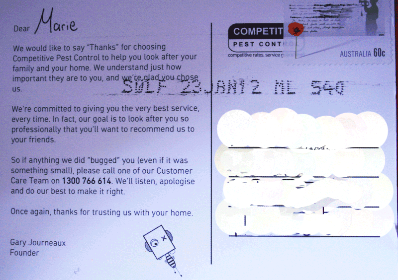 Vykort och tackkort är alltid kul att få, men det kanske känns lite konstigt att få ett efter att man fått sitt hem sanerat från kackerlackor och råttor.