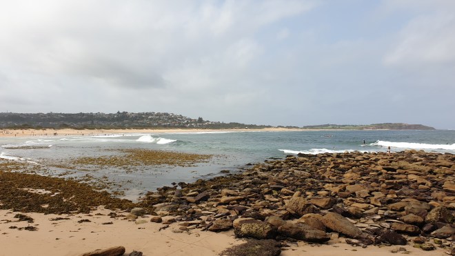 Varmt på land. Går ner i rock pools igen. Simmar 100m igen, får lite kallsup på saltvatten. Ger upp. Inte insmord.