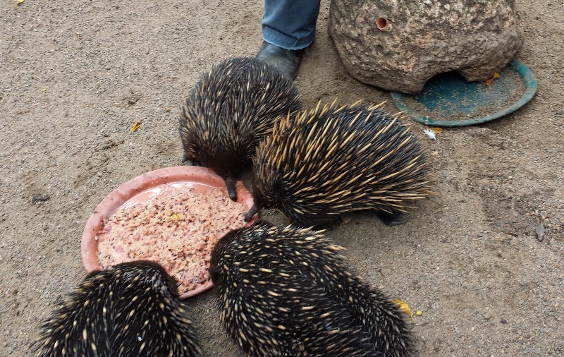 När man klappar dem (det bör man undvika i det vilda, men detta var på Featherdale Wildlife Park) så känns taggarna som plaströr. När de känner sig hotade, eller blir attakerade, så sticker de till med dessa och sedan lossnar taggen.