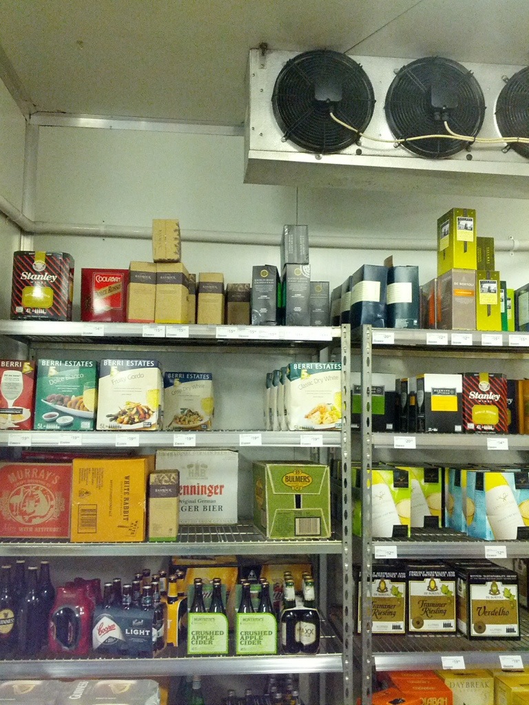 Alla butiker har kylskåp för öl, vitt vin och alla typer av alkoläsk. Allt vitt/rosevin står dessvärre inte i kylen, det brukar inte få plats. Men då finns en annan lösning på ditt problem, den finns nämligen en snabbkylare på de flesta Bottle shops. Du tar din flaska, stoppar ner den i kylaren ett par minuter och sen presto! Du har ditt kalla vita vin som du kan dricka bums.