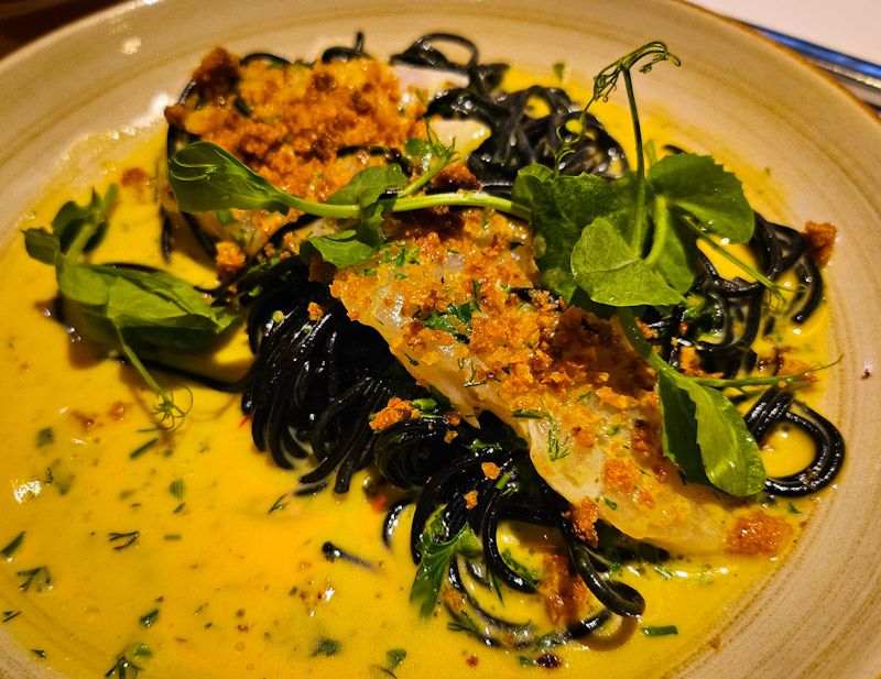 Ví landade på Stelos, och åt pasta med fisk och en flaska Chardonnay från Ghost Frog. Riktigt gott till maten. Sen fick vi en liten bit hallonsorbet på köpet. Det sa vi defintivt inte nej till. Och massor med vatten 🙂