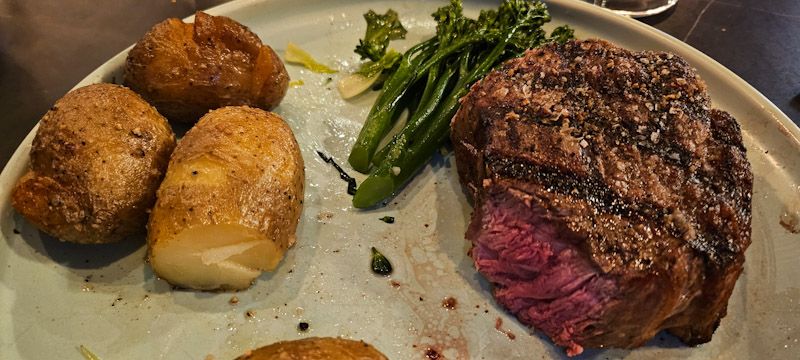 Sista kvällen. Efter lunchen, charkbricka med ost och vin på vingård, kände mamma och jag oss för kött. Och det fanns en trevlig köttrestaurang på den gatan vi ätit alla våra middagar på.