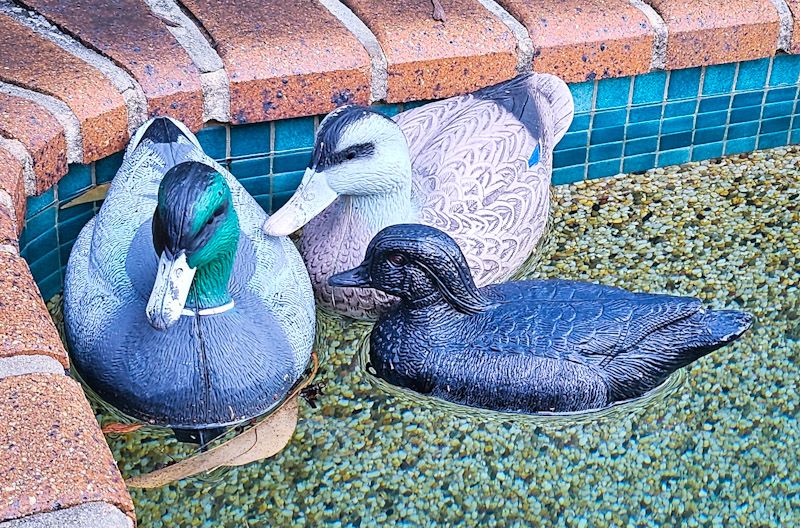 Mamma har plastankor i poolen för att avråda djur att använda poolen som sin badplats. Såsom fågelskrämma på åskar.