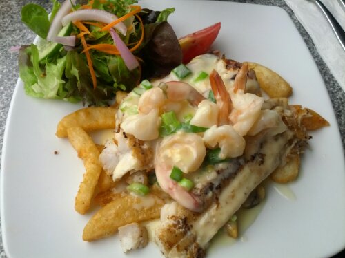 Det tog ett tag att ta oss hit, så det första på agendan var lunch. Jag ville bjuda mamma på en ståndsmässig lunch idag så vi tog oss ett bord på The Boat Shed och beställde in en seafood platter, med hummer, för två och en flaska chardonnay (The Flower Thief). Så gott, och de var inte snåla med sin friterade bläckfisk.